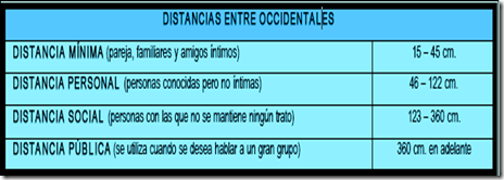 - Las distancias: Para comunicarnos necesitamos estar cerca, ya que necesitamos oír lo que nos cuentan, ver los gestos e incluso establecer contacto físico. Las distancias entre los interlocutores dependerá tanto del nivel de intimidad entre las partes como de la cultura de los interlocutores. En negociaciones internacionales este factor es muy importante, ya que si no lo tenemos en cuenta podemos estar traspasando el nivel de intimidad de nuestros interlocutores e incomodarlos sin darnos cuenta.